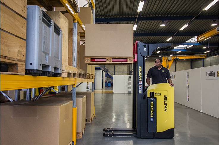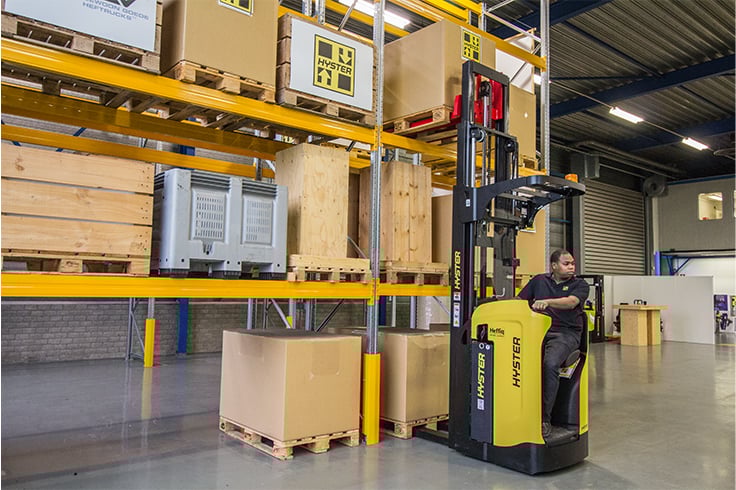 Available with 2-stage and 3-stage masts up to 6,020mm, the Rider Stacker can work in aisle widths as small as 2.5m. The rated capacity is 1,600kg. The traction motor gives powerful acceleration and has an increased travel speed of up to 9km/h. there are two different steering modes; Standard steering and Reverse steering comes as an option. Full AC infrastructure on drive and steering motors allows for seamless changes in direction, increased cycle speeds and greater control of pallet handling operations. Adjustable steering reduction on cornering provides smooth load handling and precise directional control.